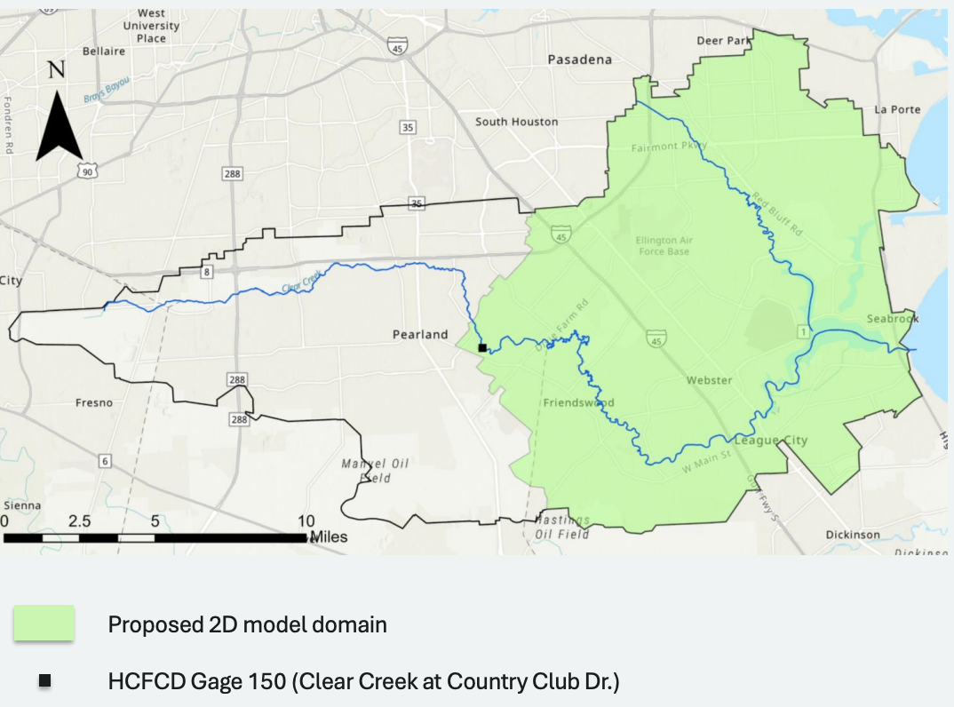 Investigate the flood impacts of the proposed gate and pump station on Lower Clear Creek watershed and evaluate potential configuration options for further flood mitigation